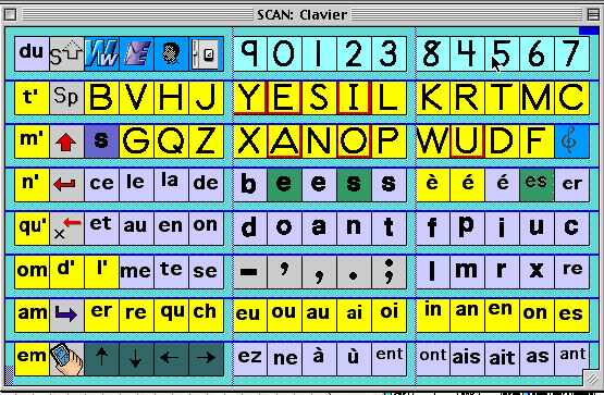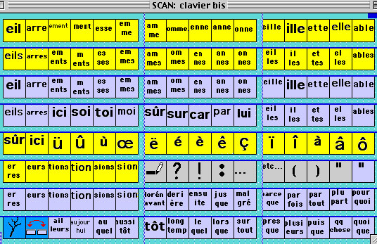 de ce type-là, préférant utiliser les touches autrement. e,s,a,r,i,n,t,u,l,o,m,d,p,c,f,b,v,h,g,j,q,z,y,x,k,w. Pour moi, la première ligne, la première colonne et la première case de chaque colonne sont plus difficiles à atteindre que les autres. La case la plus rapidement atteinte, pour moi, est donc celle de la deuxième ligne, deuxième colonne, deuxième case, c'est là que je mets la lettre la plus fréquemment employée, le e. Viennent ensuite de façon équivalente, la deuxième ligne, deuxième colonne, troisième case, la troisième ligne, deuxième colonne, deuxième case, et enfin la deuxième ligne, troisième colonne, deuxième case, c'est là que je mets les trois lettres suivantes, les s, a et r. Et ainsi de suite. Certaines touches, comme me, te, se, ce, et, le, la, de, du, au, en, et on sont là suivies d’un <space> uniquement parce qu’elles reviennent très souvent et qu’elles sont, pour certaines d'entre elles, utiles en fin de mots. Ne pouvant mettre toutes les lettres dans le clavier par manque de place, j’ai mis les lettres accentuées qui ne sont que rarement utilisées dans un autre clavier, que j’ai appelé "clavier bis", car en plus des touches û, ü, ê, ë, â, ç, î, ï, ô, œ, il contient toute une série de terminaisons qui reviennent souvent, des signes de ponctuation et des mots invariables. Chacune des touches de ce "clavier bis" est munie d’un <branch back>, ce qui ramène donc automatiquement au clavier dont on est parti. Pour accéder à ce clavier, on "frappe" sur la clef de sol bleue. Alors qu'il faut trois clics pour sélectionner une lettre sur tout clavier de Discover, il en suffit de cinq (trois si on fait les bons réglages dans les préférences de Discover , ceci est expliqué dans la conclusion) pour sélectionner une case dans "clavier bis". Ajoutez à ça deux petits temps de latence pour passer d'un clavier à l'autre, attraper une lettre dans "clavier bis" se fait plus rapidement que d'effectuer deux frappes dans "clavier".